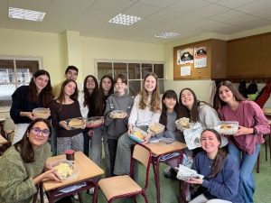 Se dice que si consigues dar la vuelta a la crêpe en la sartén con la mano derecha mientras sostienes algo de oro en la mano izquierda, tendrás dinero ese año. Los alumnos de toda la ESO que cursan Francés han seguido la receta que sus profesoras les han proporcionado y juntos han celebrado en clase este día, aunque con retraso porque coincidía con otras actividades.