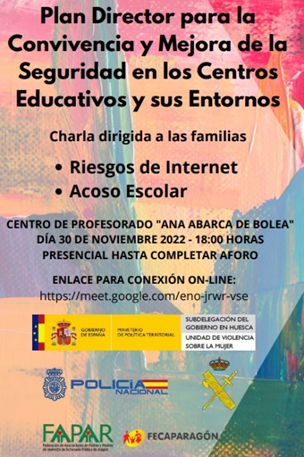 El enlace para seguimiento online será: https://meet.google.com/eno-jrwr-vse En la primera fecha se tratarán los temas de «Riesgos de Internet» y «Acoso Escolar».